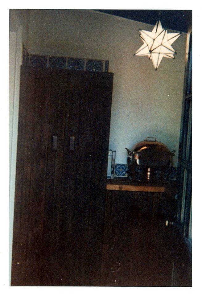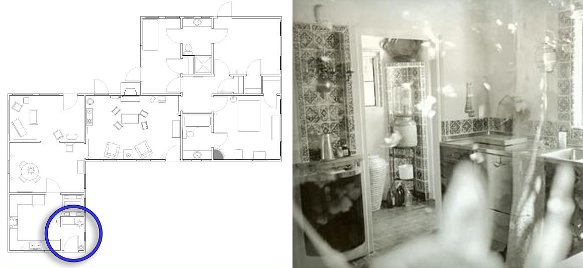 The fixture is visible in period photographs of the Brentwood residence, suspended from the ceiling of the back porch just off the kitchen. In the accompanying floor plan, the blue circle indicates the precise location where the white star light once hung. A photograph of Marilyn’s kitchen shows the doorway leading directly into that porch space, anchoring this object to a documented and intimate area of her final home.