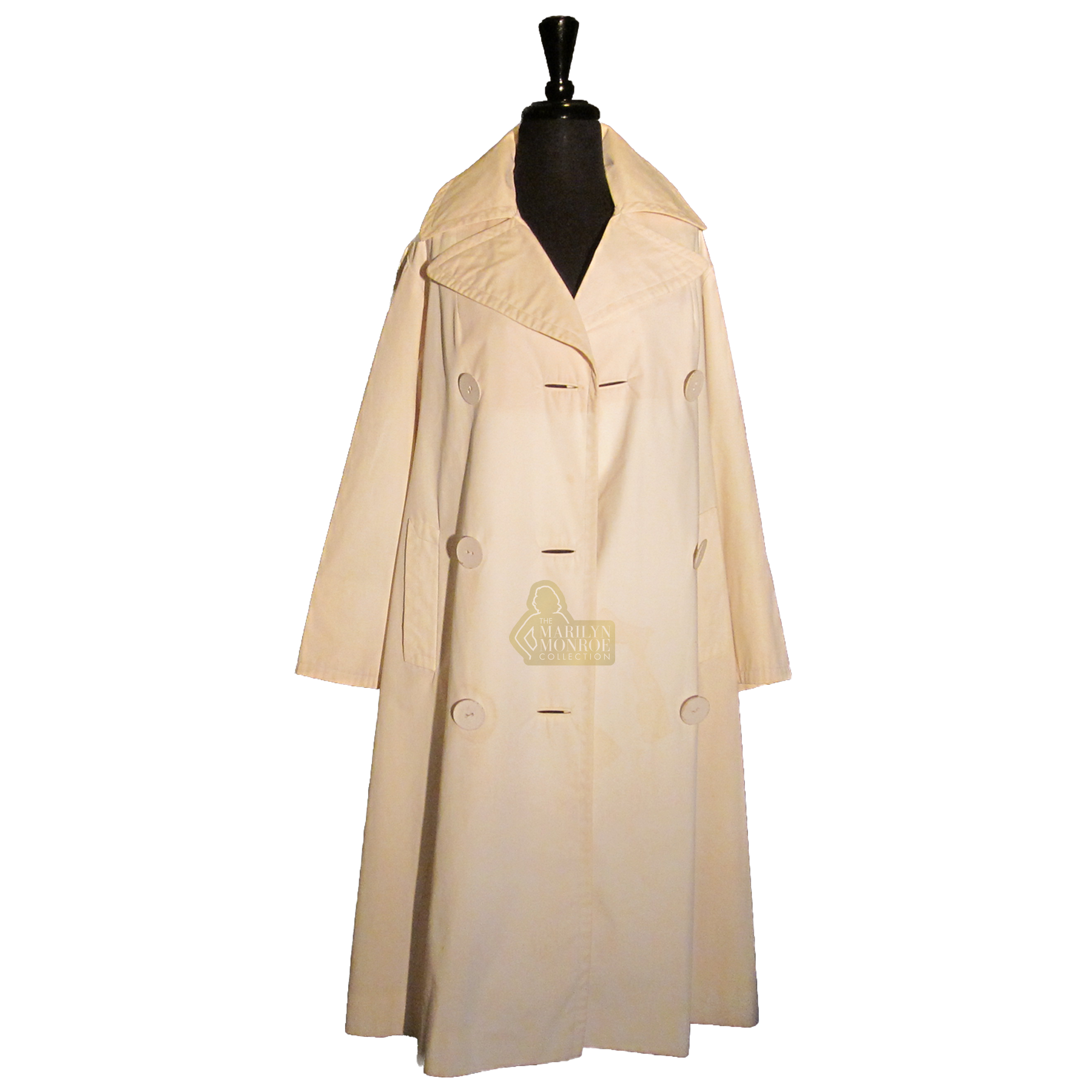 From the personal wardrobe of Marilyn Monroe: An ivory cotton overcoat with satin lining. The label reads “Styled by Lawrence of London” and “Bergdorf Goodman on the Plaza, New York.” Marilyn wore this coat when she left Polyclinic Hospital in New York on July 11, 1961, following gallbladder surgery. She wore it again in early 1962 while traveling to Mexico City.