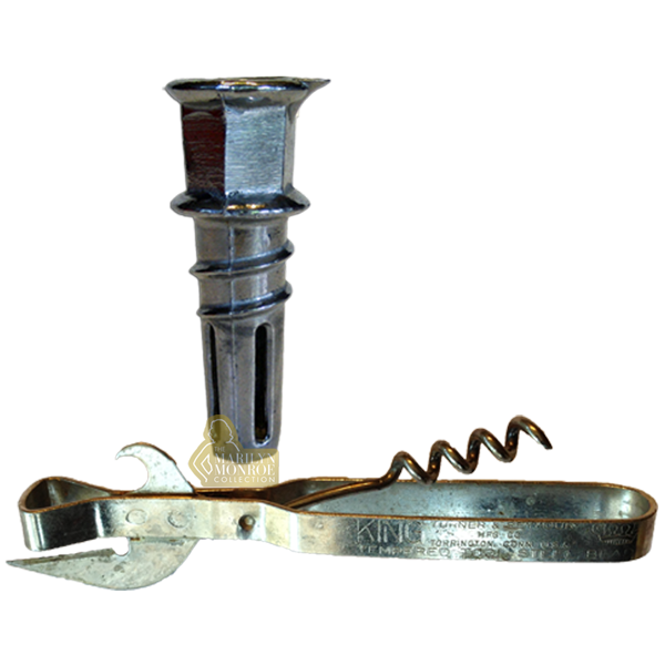 From the estate of Marilyn Monroe: A metal can opener with a built in corkscrew attachment, and a metal pouring spout, engraved “Made in Germany.”
