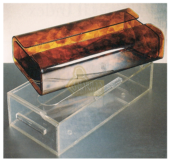 Two tissue box covers from the personal effects of Marilyn Monroe. Both covers are made of plastic. One has the effect of tortoise shell, and the other is constructed of clear plastic. The clear plastic cover was likely custom made for Marilyn as it appears to be hand crafted and not mass produced.