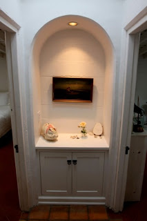 This nook is in the hall immediately off the right side of the living room. This hallway was added by other owners after Marilyn died. The door to Marilyn’s dressing room is on the left. The door to Marilyn’s bedroom is on the right. Note that it’s not the original doorway to Marilyn’s bedroom.