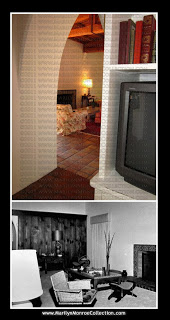 I took the color photo in the collage below while looking out of Marilyn’s dining room into her living room. The included b/w photo shows this same peaked doorway to the far left along the wood paneled wall.