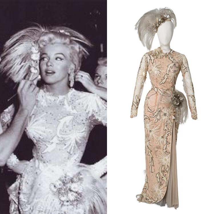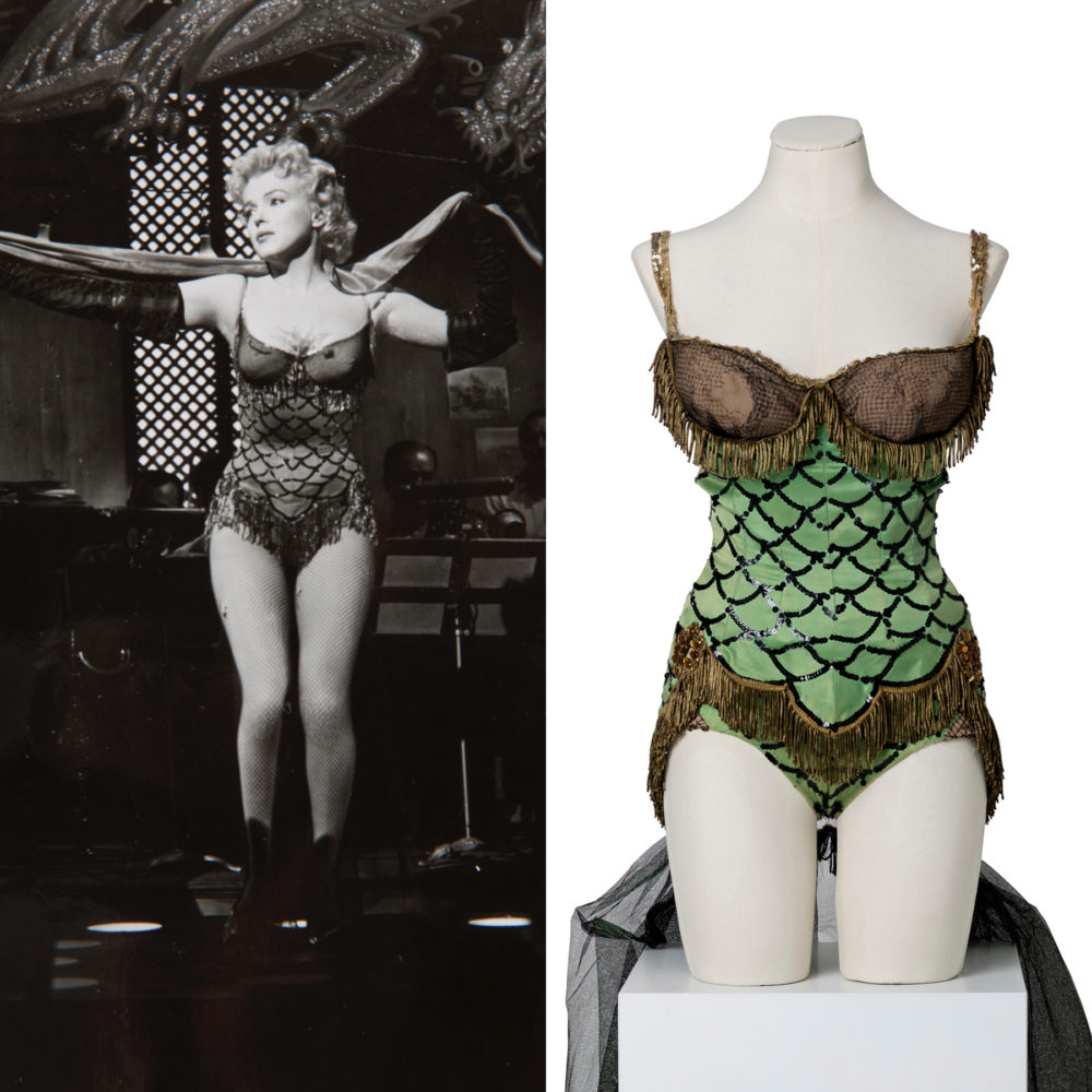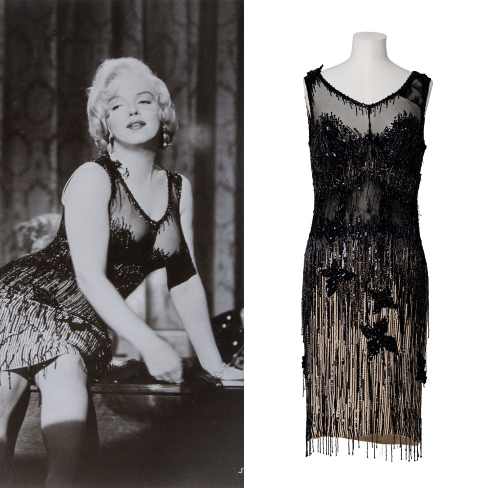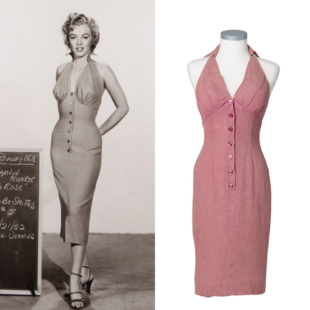 It was a thrill for me to catalog the world-famous David Gainsborough-Roberts Marilyn Monroe collection for that auction. His archive included film worn costumes, personal clothing and gowns, and Marilyn Monroe personally owned items. Highlights from David’s collection included a sheer black beaded and sequined dress worn by Monroe in her Golden Globe winning role of Sugar Kane as she crooned “I’m Through With Love” in the award winning 1959 film Some Like it Hot; an elaborate embellished stage gown worn by Monroe as she sang “After You Get What You Want You Don’t Want It” in the 1953 comedy There’s No Business Like Show Business, which was designed by one of Marilyn’s all-time favorite designers, William Travilla; a pink linen halter wiggle dress designed for Monroe by Dorothy Jenkins for the 1953 thriller Niagara; and a green satin one-piece with black sequins and gold fringe worn by Monroe as she sang “That Old Black Magic” in the 1956 film Bus Stop.