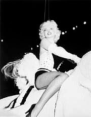 The picture from the studio magazine shows the cast on the stage. MM had sung a song directed by Alfred Newman. I, in the tuxedo with a tray in hand, am to serve her a cocktail. When I did, she kissed me on the cheek. This is possibly her first kiss on stage. Is anyone else still around who was in that play? I can be contacted via e mail. the date of the play was Tuesday, March 16, 1948. My name is Robert Temple.
