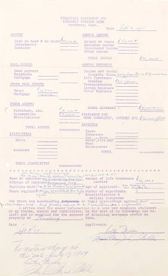 A mimeographed form with three fold marks titled ‘Financial Statement for Woodbury Savings Bank;’ dated “Sept 9, 1957;” mostly filled out by a bank employee in blue ballpoint ink with information such as age (“Mrs. Miller 31 / Mr. Miller 41”), annual salary (“$50,000+”), employer (“20th Cent. Fox Co.”), etc., with an additional note reading “Suit pending against M.M. Productions as a corporation” [See LOTS 7004 and 7005]; signed in blue ballpoint ink on the lower right side by both Arthur Miller and “Mrs. Marilyn Miller” and further signed on the lower left side by Miller and “Marilyn Monroe Miller.” This form was for “mortgage credit on property at Roxbury, Conn.” where the couple bought a vacation home; included is a different photocopied form also relating to this same transaction.