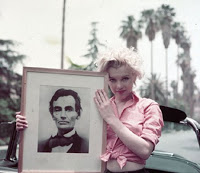 From The Marilyn Encyclopedia: The 16th president of the United States was a hero to Marilyn ever since she wrote an essay on him in junior high school. Soon after meeting Arthur Miller in 1950, Marilyn wrote a letter in which she confessed, “Most people can admire their fathers, but I never had one. I need someone to admire.” Miller wrote back, “if you want someone to admire, why not Abraham Lincoln?” Marilyn went out and bought a large framed portrait and a biography written by Carol Sandburg, with whom she later became friends.She reputedly also kept a copy of Lincoln’s Gettysburg Address for inspiration. On screen in Bus Stop (1956), Don Murray, playing country boy Bo Decker, tries to get Marilyn to become “attracted to his mind” by reciting her the Gettysburg address. For years Marilyn gave her framed photo of Lincoln pride of place in her homes at Doheny Drive in Beverly Hills, at the Waldorf-Astoria suite in New york, and later in a smaller version on her nightstand at the East Fifty-Seventh Street apartment she shared with Arthur Miller.