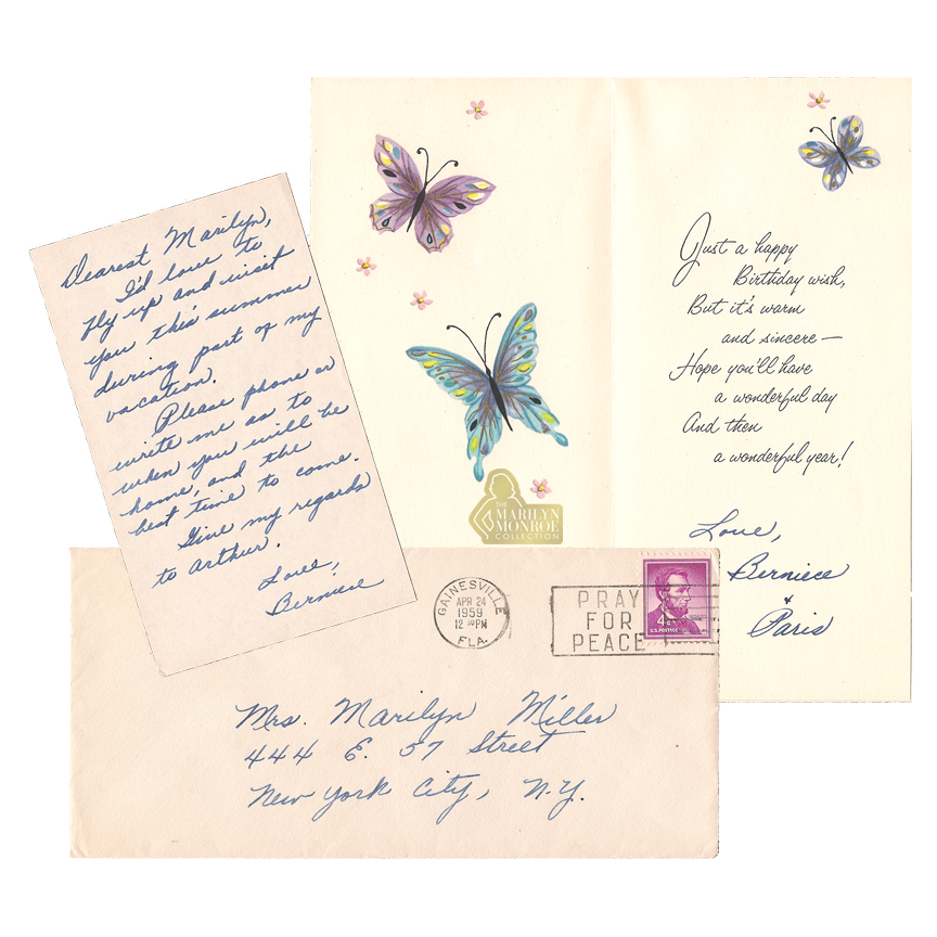 This original birthday card, sent to Marilyn Monroe in April 1959 by her half sister Berniece Miracle, represents one of the most personal and meaningful surviving examples of family correspondence from Marilyn’s adult life. The card is preserved together with its original handwritten enclosure and transmittal envelope, addressed to “Mrs. Marilyn Miller” at her residence at 444 East 57th Street in New York City and postmarked Gainesville, Florida.