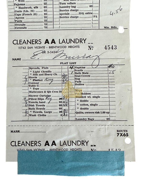 Cleaners A A Laundry operated on a neighborhood collection and delivery route serving Brentwood residents. Monroe’s use of the service reflects a practical domestic structure in which household maintenance was handled through outside providers rather than exclusively within the home itself.