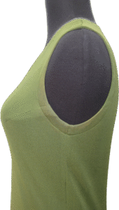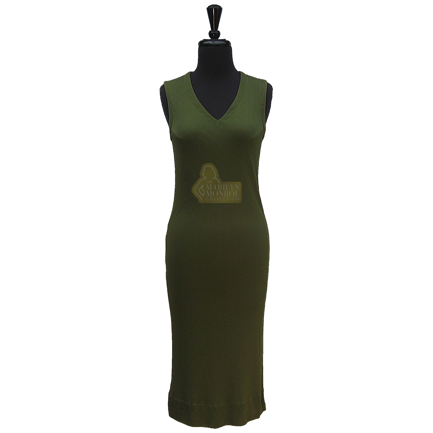 An olive green double-ply silk jersey sleeveless dress; interior label reads: “Walter Bass/Design.”