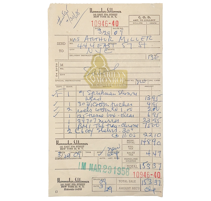 From the Personal Files of Marilyn Monroe: This original sales receipt from Hammacher Schlemmer in New York is dated March 29, 1958 and documents a series of household purchases made by Marilyn Monroe while she was living at 444 East 57th Street. The receipt is written out to “Mrs Arthur Miller,” reflecting the married name she used during her marriage to playwright Arthur Miller.