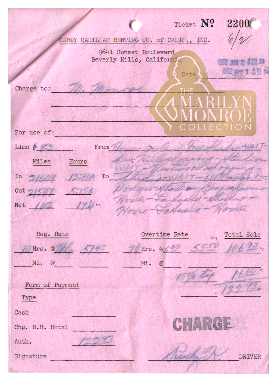 The original June 1, 1962 invoice from the Carey Cadillac Renting Company, now part of The Marilyn Monroe Collection, records her movements throughout the day.