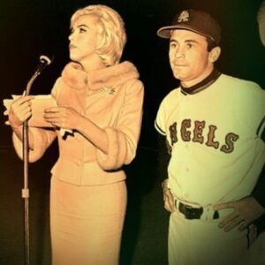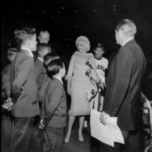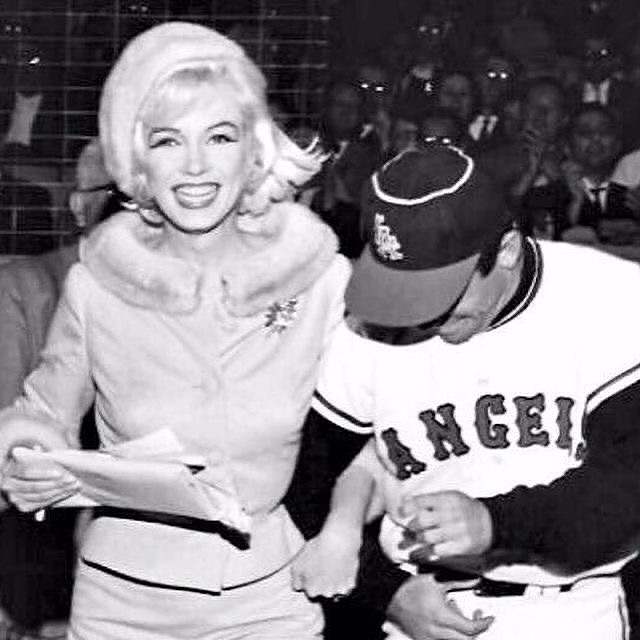 June 1, 1962 marked Marilyn Monroe’s final public appearance at Dodger Stadium, where she took part in pre game ceremonies to benefit the Muscular Dystrophy Foundation. She wore a costume from her final film, Something’s Got to Give. Angels outfielder Albie Pearson escorted her to the pitcher’s mound.