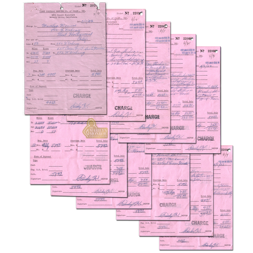 From the Personal Files of Marilyn Monroe: This group of eleven original receipts from the Carey Cadillac Renting Company documents Marilyn Monroe’s use of private limousine transportation during the final months of her life in 1962. The receipts provide detailed records of her travel on specific dates in February, May, and June of that year, outlining the logistical arrangements supporting her professional and personal movements throughout Los Angeles.