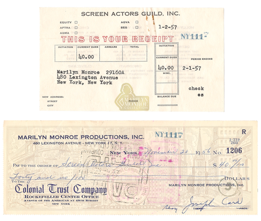 From the Personal Files of Marilyn Monroe: This original receipt from the Screen Actors Guild documents Monroe’s membership for the 1956 to 1957 term. Preserved with the receipt is a Marilyn Monroe Productions bank check dated November 20, 1956 issued in payment of her dues and signed by business manager Joseph Carr.