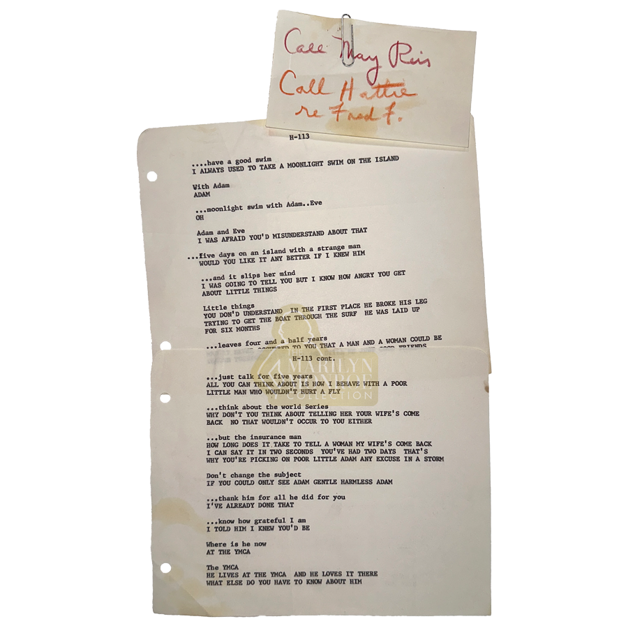 These script sides correspond to scenes filmed with co-star Dean Martin, and surviving production footage confirms Marilyn performing portions of this dialogue on camera. The pages capture not only the structure of the scene, but the rhythm of Marilyn’s performance as it was actively being shaped during production.