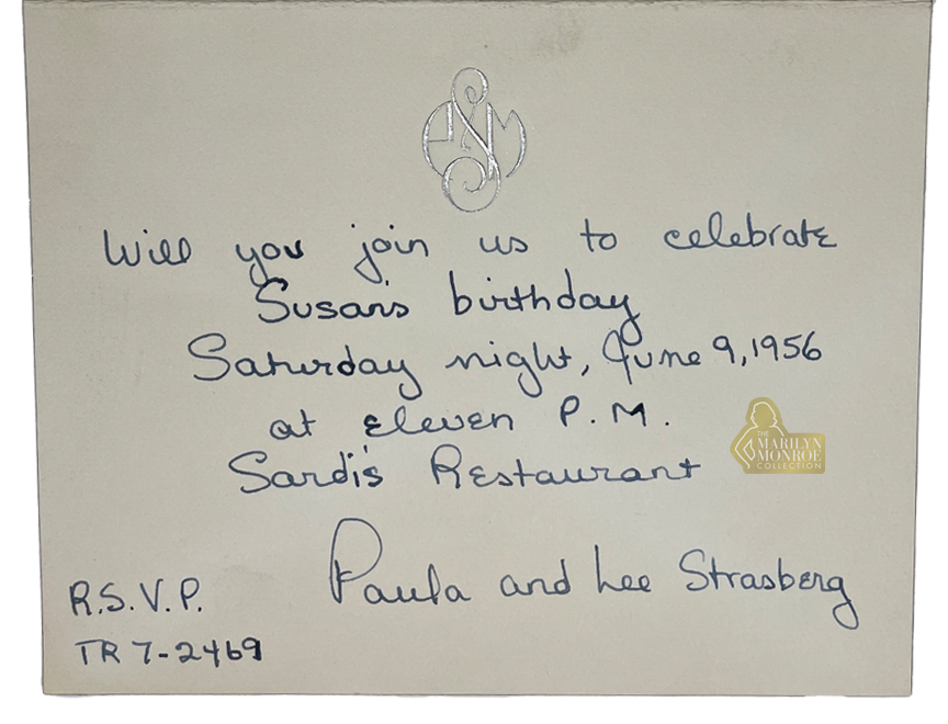 This invitation, handwritten by Paula Strasberg, was sent to Marilyn Monroe, inviting her to attend a birthday celebration for daughter Susan Strasberg held at Sardi’s Restaurant in New York City on June 9, 1956. On the reverse side of the invitation, Marilyn wrote a personal note to herself: