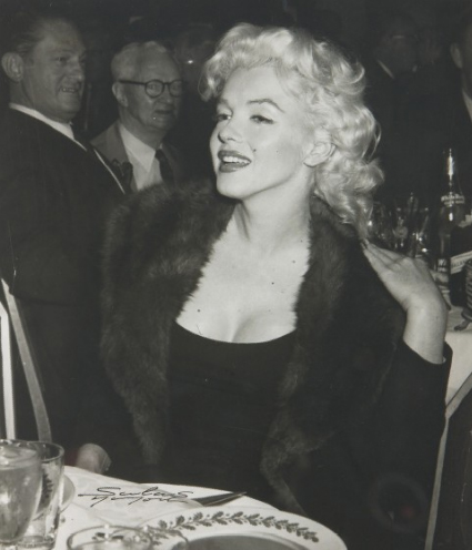 As she walked her famous walk in her very high black stiletto heels, cars and trucks just pulled over to the curb and drivers emerged from them shouting “Marilyn! Marilyn!” When we finally got the three blocks over to Fifth Avenue, we then had to walk uptown to 54th-55th Streets. As we arrived at the doorway to Elizabeth Arden’s salon, I heard the nearby sounds of an automobile crashing, and looked over to see a taxicab driver whose head was bobbing out of the passenger-side front window of his cab, the vehicle itself now embedded in the back end of a delivery truck! He had a gleeful smile on his face and was hollering, “Marilyn!” I tapped her on the shoulder and exclaimed “See what you did!” She gave me a very “Marilynesque” laugh and swept rather grandly into the salon.