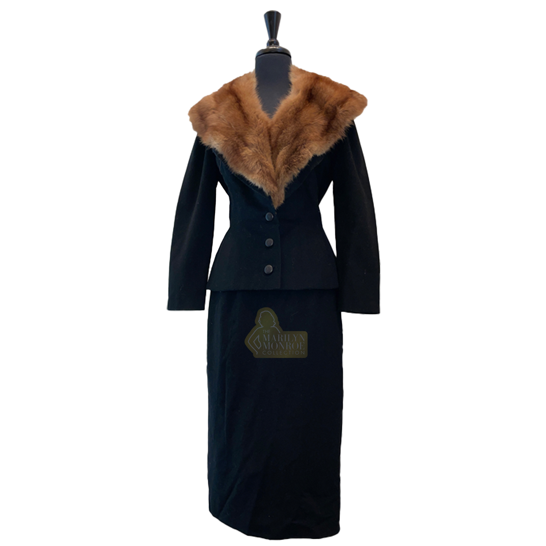 From the personal wardrobe of Marilyn Monroe, this black wool suit consists of a tailored jacket, matching skirt, and detachable mink fur collar. George Nardiello designed it in the mid 1950s, when he was working closely with Marilyn.