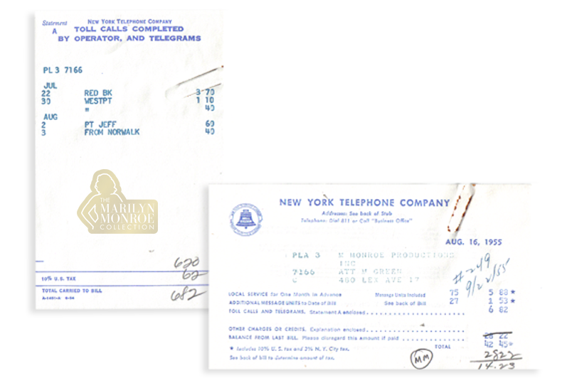 From the Personal Files of Marilyn Monroe: Dated May 16, 1955, and August 16, 1955, these original New York Telephone Company monthly billing statements were issued to Marilyn Monroe Productions, Inc., care of Milton Greene, at the company’s offices at 480 Lexington Avenue in New York City.