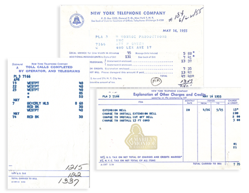 From the Personal Files of Marilyn Monroe: Dated May 16, 1955, and August 16, 1955, these original New York Telephone Company monthly billing statements were issued to Marilyn Monroe Productions, Inc., care of Milton Greene, at the company’s offices at 480 Lexington Avenue in New York City.