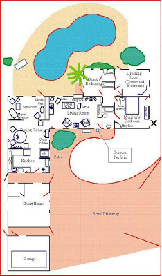 I recently came across an online real estate website with many additional images of Marilyn’s house and property. Included in this post are several photos of the grounds and buildings that make up the property. As a point of reference for this blog post, I’ll use the map of the property below to help you orient yourself with the grounds.