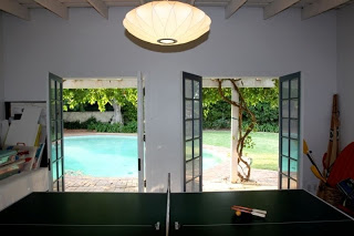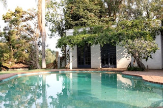 These photos show a structure that was added later, and it sits to the right side of the pool (not annotated on the map). It appears to have been used primarily as a game room. A ping-pong table was inside the structure when I toured the property in July of 2010.