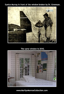 The photo below shows another view of the window that was broken by Ralph Greenson (on the right) to gain entry to the room due to the alleged locked bedroom door.