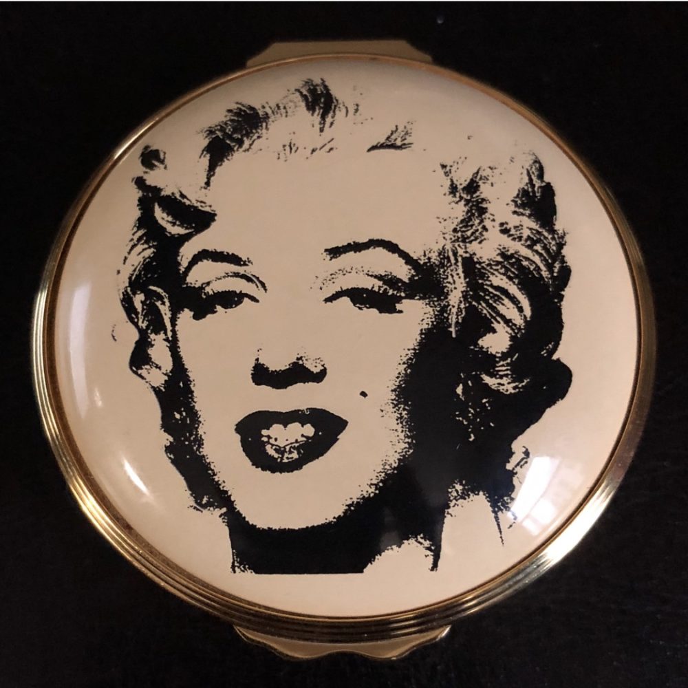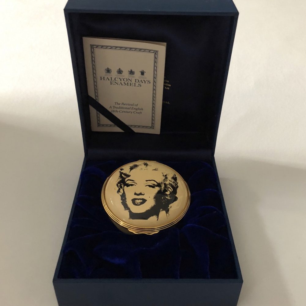 Anna had another storage unit filled with licensed collectibles and memorabilia, some of which I’d never seen before. This storage unit contained unbelievable memorabilia: Watches, tins, purses, ties, clocks, shirts, holiday ornaments, magnets, puzzles, towels, reading glasses, sunglasses, journals, coffee mugs, bed sheets, posters, buttons, stickers, ink stamps, pins, checkbook covers, postcards and postcard books, gift bags, dress patterns for Marilyn’s costumes, belt buckles, and even wrapping paper. There were countless items, and the facility was overflowing with first-run and prototype memorabilia samples. It was a collector’s dream to see all of these items (still in their original packaging). Anna actually gave several items to me as gifts, including this enamel gift box by Halcyon Days, featuring Andy Warhol’s “Marilyn Monroe” silkscreen from 1964. This was the first gift box produced, the original prototype. It’s unnumbered.