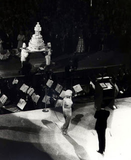 John F. Kennedy: JFK Birthday Cake Side Decoration from May 19th, 1962. In remembering John F. Kennedy, we recall pleasant events that took place during the time of “Camelot”: children romping in the Oval Office, touch football games, boating in Hyannis Port, a gracious White House First Lady, press conferences accented by flashes of brilliant humor by the President, the “Rat Pack,” and Hollywood celebrities. One event has truly taken on legendary proportions, namely the birthday party given at Madison Square Garden to celebrate JFK’s 45th birthday. No one can forget sultry Marilyn Monroe in her skin-tight sequined dress singing, or heavily-breathing, a rendition of “Happy Birthday, Mr. President”. JFK’s reaction was a mixture of pleasure and embarrassment. Later revelations about a romantic relationship between Monroe and the Kennedy brothers only serve to make the moment more laced with innuendo and emotion. Presidential birthday parties had begun during Franklin Roosevelt’s presidency. The tradition was revived for JFK, while the added novelty of an influx of Hollywood celebrities. The party was attended by 15,000 guests and hosted by Jack Benny. Performers included: Robert Merrill, Ella Fitzgerald, Jerome Robbins, Danny Kaye, Henry Fonda, Maria Callas, Peggy Lee, Jimmy Durante, and Bobby Darin. Marilyn Monroe, just a few months shy of her untimely death, was introduced by Peter Lawford, JFK’s brother-in-law.