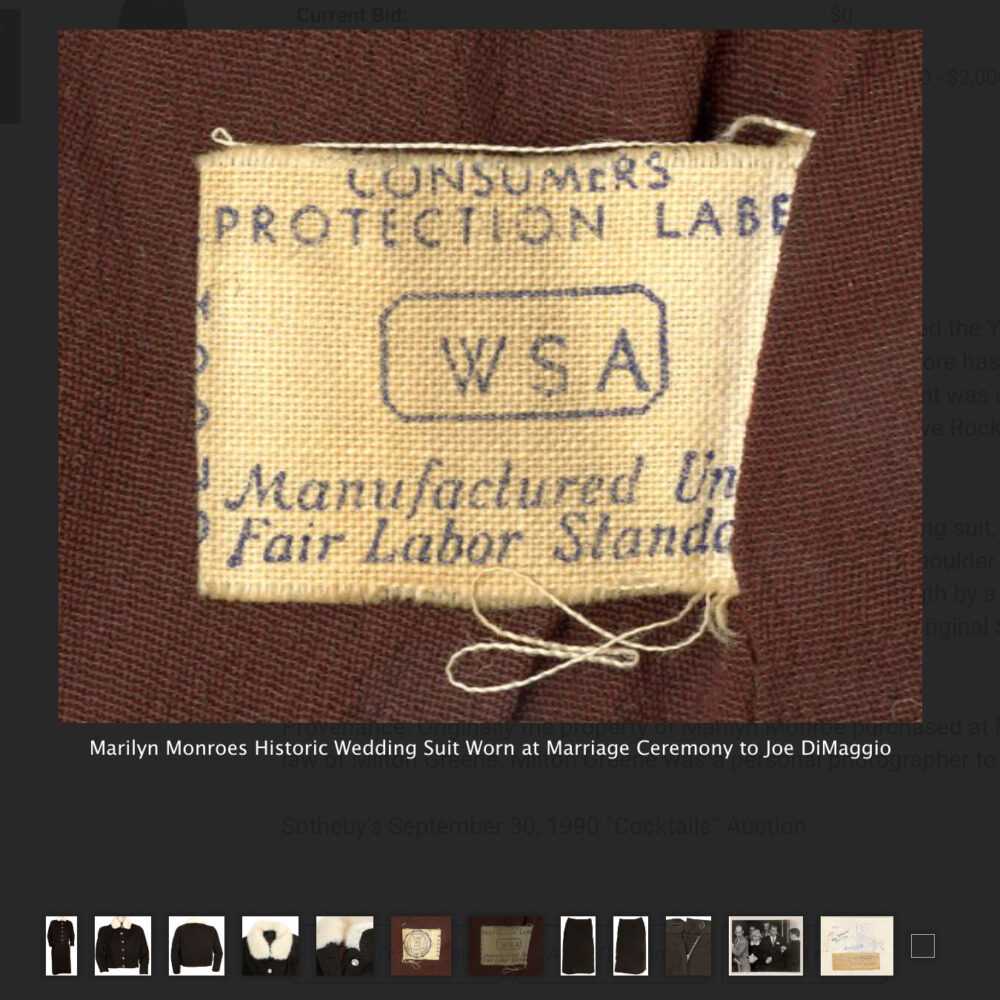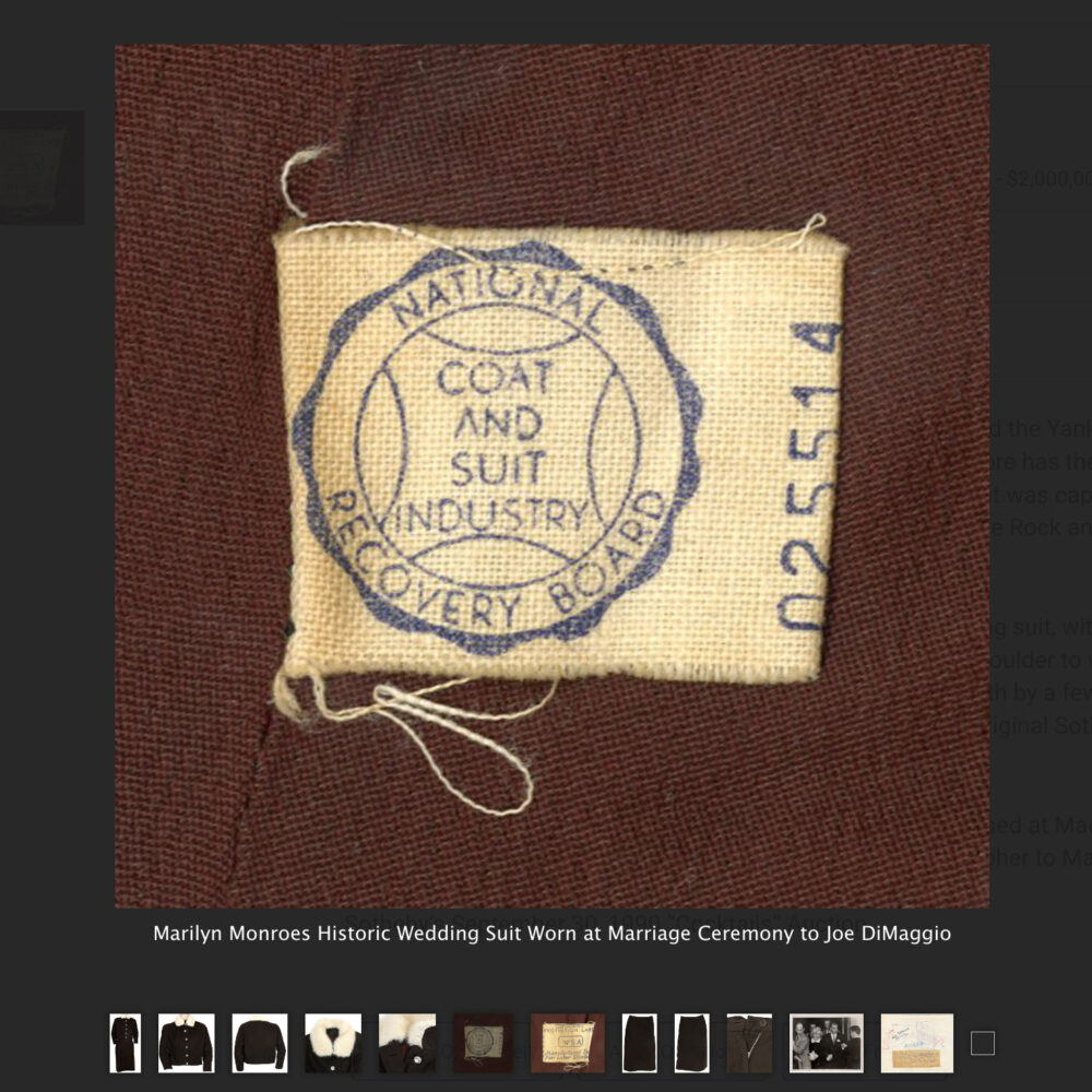 We want to thank you for your your efforts to confirm this is the suit Marilyn Monroe wore to her wedding with Joe DiMaggio. We will attempt to answer your questions: