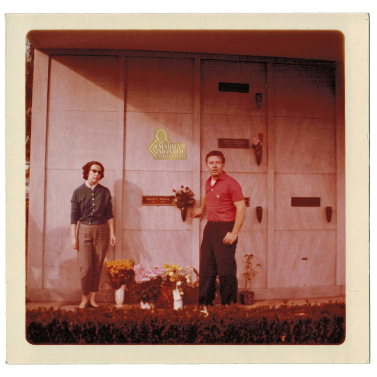 Several years ago, a vintage Polaroid was added to The Marilyn Monroe Collection showing a couple visiting Marilyn Monroe’s crypt at Westwood Village Memorial Park, likely taken shortly after her death in 1962. The photograph captures a quiet and deeply respectful moment. Red roses rest in the vase on her crypt, likely placed by Joe DiMaggio, while sunlight illuminates the space, isolating Marilyn’s final resting place and those who came to honor her.