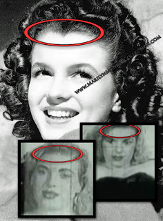 The photos below show Norma Jeane, taken around the same time this porno was allegedly filmed, together with screen captures from the film. Note Norma Jean’s widow’s peak. Note also the distinct absence of a widow’s peak along the hairline of the “porn star.” Could this be the case of the missing widow’s peak?