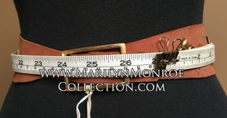 This belt measures 27 inches (on the outside of the belt) when fastened. Of course, this doesn’t even take into account the layers of clothing Marilyn wears under the belt. Marilyn is pictured wearing this belt at RKO Studios.