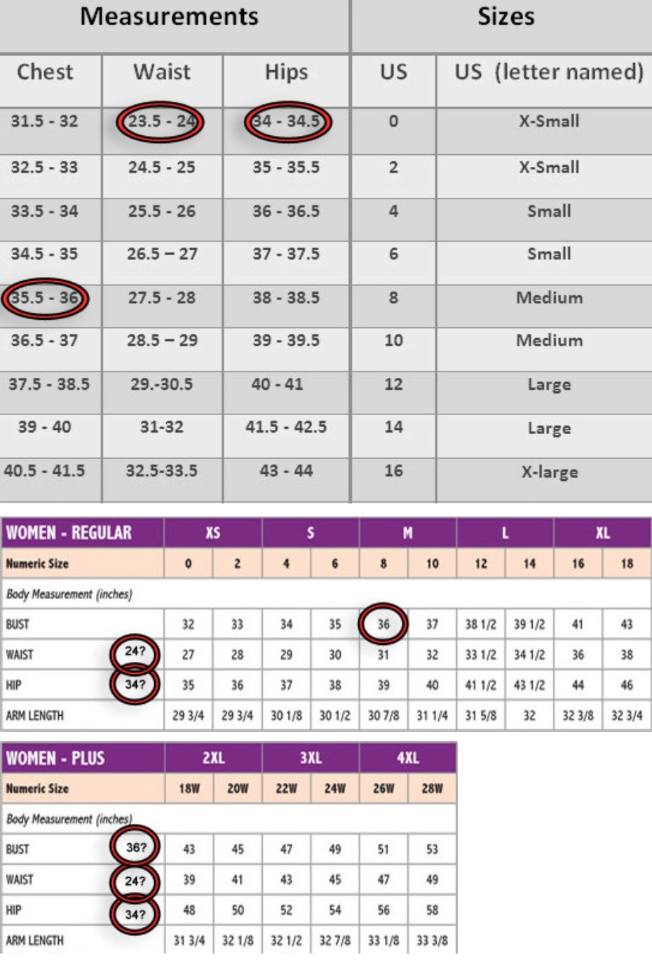 In 1945, Marilyn’s dimensions were 36-24-34. The red circle on these charts demonstrate how her body was different. Note the “X-Small” and “Medium” sizes.