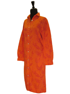 A red cotton button-down casual garment with a pattern of roosters and chickens, long sleeved with pockets at each side, worn as a maternity dress during Marilyn’s 1958 pregnancy during and after filming of Some Like It Hot.