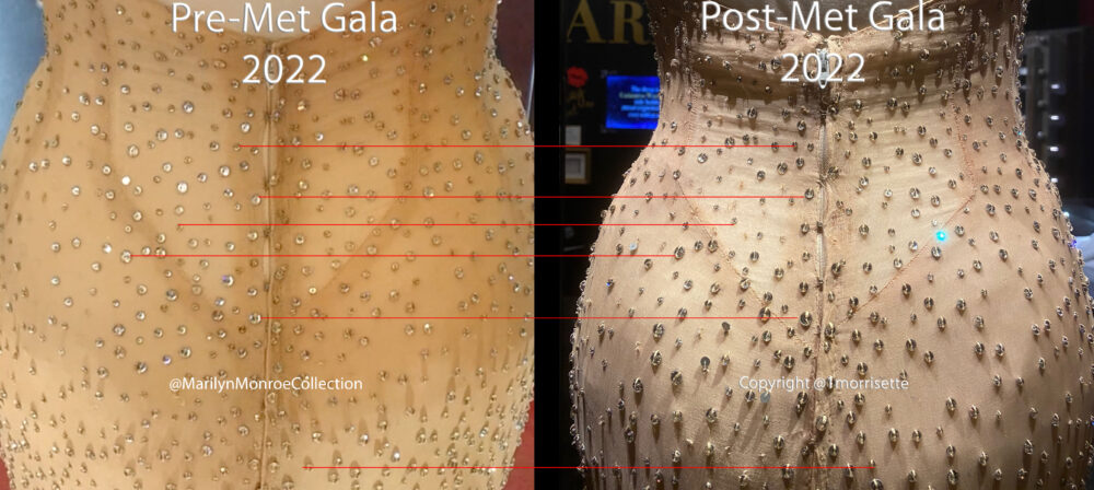 Videos and photos tell the accurate and truthful story about the damage to Marilyn Monroe’s “Happy Birthday, Mr. President” dress. A screenshot from a video posted by Ripley’s, filmed during Kim Kardashian’s April 21 fitting in Orlando (below left), compared with a photo of the back of the dress, taken by ChadMichael Morrisette (below right), on June 12 — 52 days later — verifies that there are several crystals missing from the back of the dress.