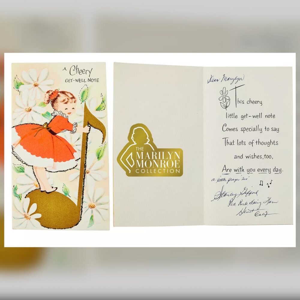 “Dear Marylyn,” begins Gifford’s message, with Monroe’s name spelled incorrectly, before the card’s pre-filled text reads, “This cheery little get-well note comes specially to say that lots of thoughts and wishes, too, are with you every day.”
