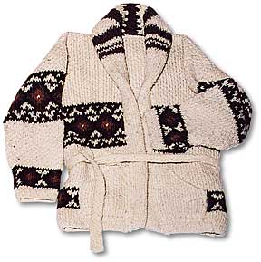 From the personal wardrobe of Marilyn Monroe: A hand-knitted cardigan of cream wool decorated with a brown geometric pattern across the center, cuffs and the neck, with matching knitted belt.